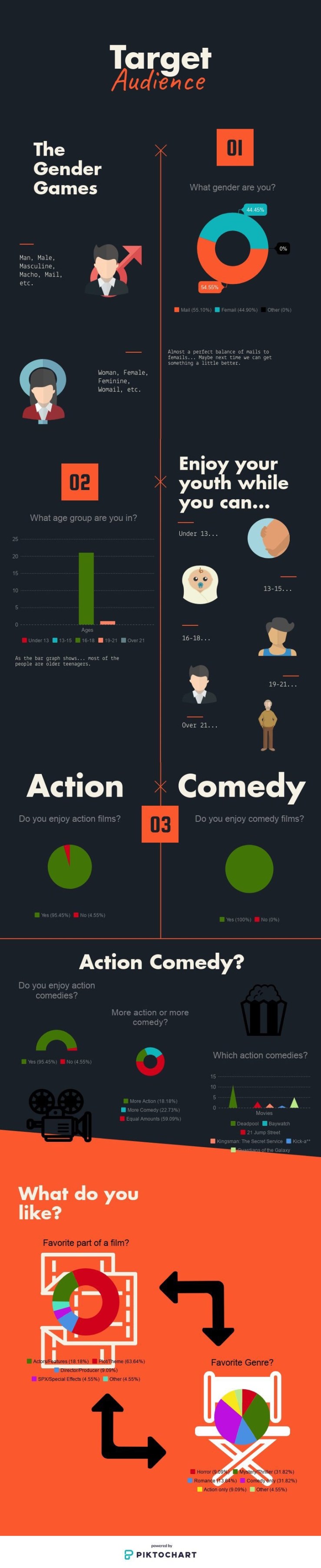 My partner and I believed it would be best to target our film to the younger crowd. Mostly due to the fact that we know what “we” enjoy. It would have been weird trying to create a movie for babies or worse… THE ELDERLY. No offense to them, it’s just we don’t really know what they like To watch. So to ensure that people enjoy and appreciate our ridiculous humor and obnoxious comments we made sure to target this film to the teenagers of the world. In order to ensure that our genre of action comedy would be a big hit for this target audience, we created a survey with questions relating to action comedies. For example, “Do you enjoy comedy films?”, “Do you enjoy action films?”, “Do you enjoy action comedy films?”, etc. This will show us whether or not our target audience is actually into watching action comedies. We evidently got outstanding feedback. Our target audience was invested and ready for the “dynamic duo” to create an intro to an action comedy. In the survey we also asked what they’re favorite action comedy film was to see what aspects we should include in the intro. The people really enjoyed Deadpool over all the other films, so we knew that we had to include the breaking of the 4th wall, and heavy amounts of action mixed with enough comedy. Another critical result we have obtained is the other genres the like (other than action comedy). People stated that that they liked mysterious and thrillers. With this we can include some aspects of this genre to further invest and entertain the audience with something they enjoy watching.