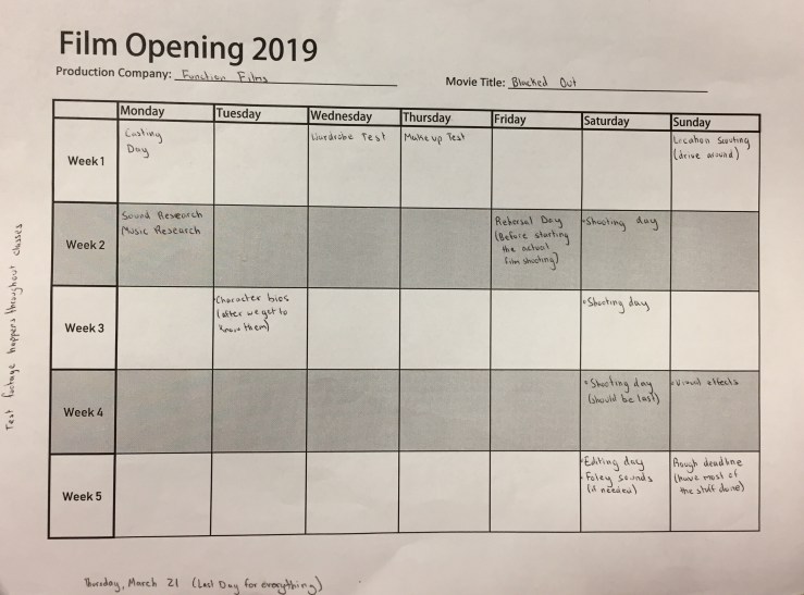 My partner and I scheduled the production of our film opening by choosing dates which will benefit both of our everyday lives. Choosing dates which will keep it organized and flexible in cases of emergencies.